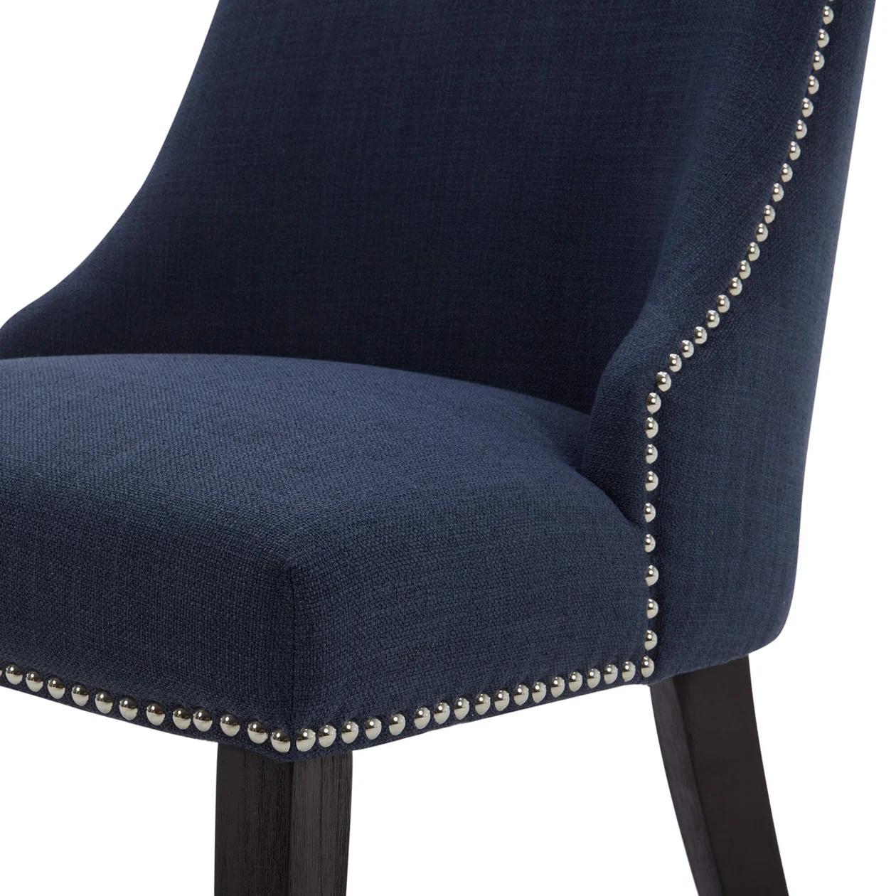 Add timeless elegance to your dining space with the Navy Blue Nailhead Dining Chair, a perfect blend of classic charm and modern sophistication. Upholstered in rich navy blue fabric, this chair features a gently curved backrest designed for ergonomic comfort and visual appeal.